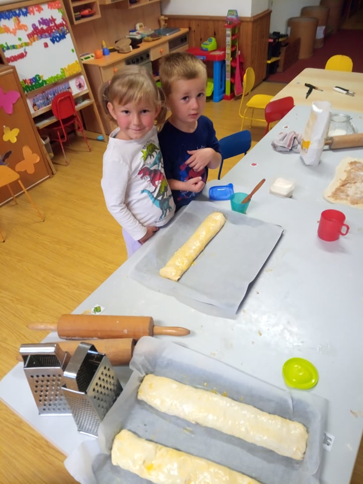 Jak trávíme podzimní dny ve školce? Chodíme na procházky, kde cestou stavíme domečky z přírodnin, pouštíme letadla, sbíráme houby a užíváme si venku společně spoustu zábavy. A nebyl by to podzim bez pořádné úrody jablíček, ze kterých se nám povedlo upéct výborné štrůdly :)